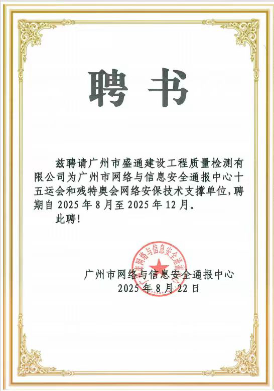 盛通檢測(cè)在全運(yùn)會(huì)網(wǎng)絡(luò)安全保障中的卓越表現(xiàn),源于一份沉甸甸的官方信賴。早在賽事籌備階段,廣州市網(wǎng)絡(luò)與信息安全通報(bào)中心便正式聘請(qǐng)我司為“十五運(yùn)會(huì)和殘?zhí)貖W會(huì)網(wǎng)絡(luò)安保技術(shù)支撐單位”,這既是對(duì)公司技術(shù)能力的高度認(rèn)可,也賦予了公司在關(guān)鍵時(shí)期守護(hù)網(wǎng)絡(luò)安全的核心職責(zé)。