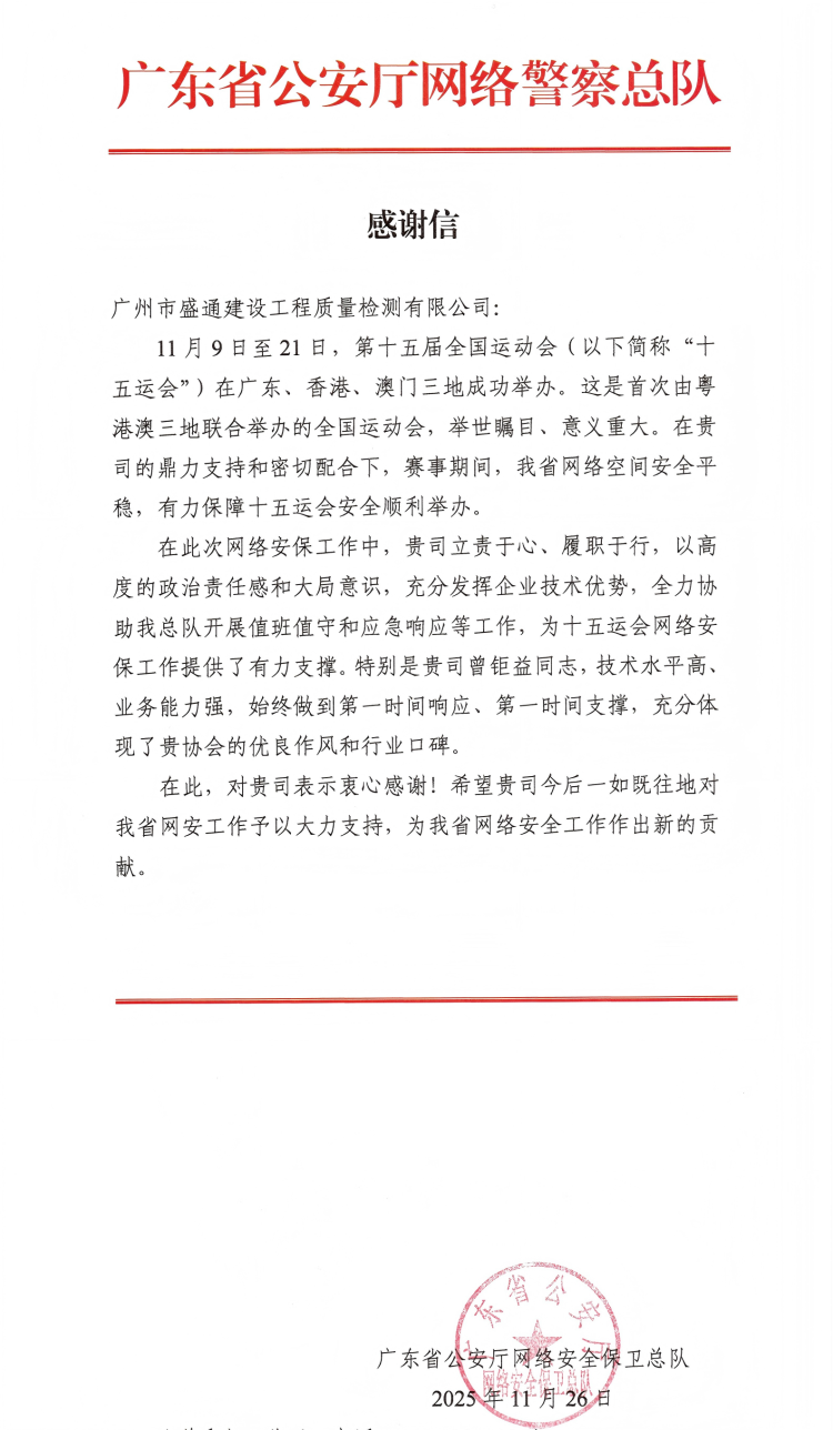 近日,盛通檢測(cè)獲得來(lái)自廣東省公安廳網(wǎng)警總隊(duì)的表彰,省網(wǎng)警總隊(duì)對(duì)公司在第十五屆全運(yùn)會(huì)期間提供的網(wǎng)絡(luò)安全保障支持給予了高度肯定,為賽事期間我省網(wǎng)絡(luò)空間的安全平穩(wěn)提供了有力支撐。